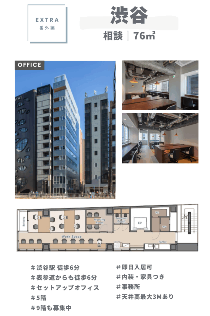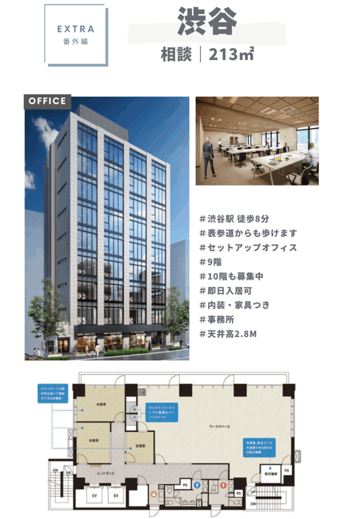 - コエル渋谷青山通り(76㎡/相談) → 新築ビル、20名規模のコンパクト本拠地におすすめ