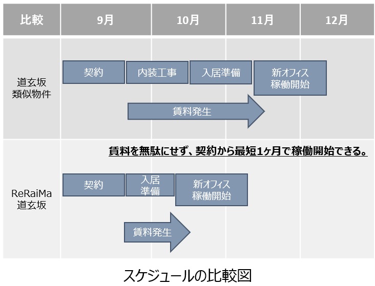 居抜きオフィスの場合、残置物の状態確認や修繕、追加工事の有無などで入居まで時間がかかることがあります。