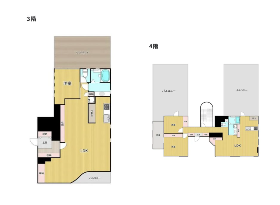 元々オーナー様の住居であったため、この2区画は内階段で繋がっていますが、別々に契約することもOKです。その場合は内階段を鍵で締め切る形となります。もちろん同時契約も可!ですし、つながりある空間として使用することでより自由自在にアレンジができそう。3階4階それぞれにアイランドキッチンやバス・トイレ、空調も完備されているためSOHO使用としても問題なく過ごせます。どちらもバルコニー付きですが、特に4階には壮大なバルコニーが2つも!