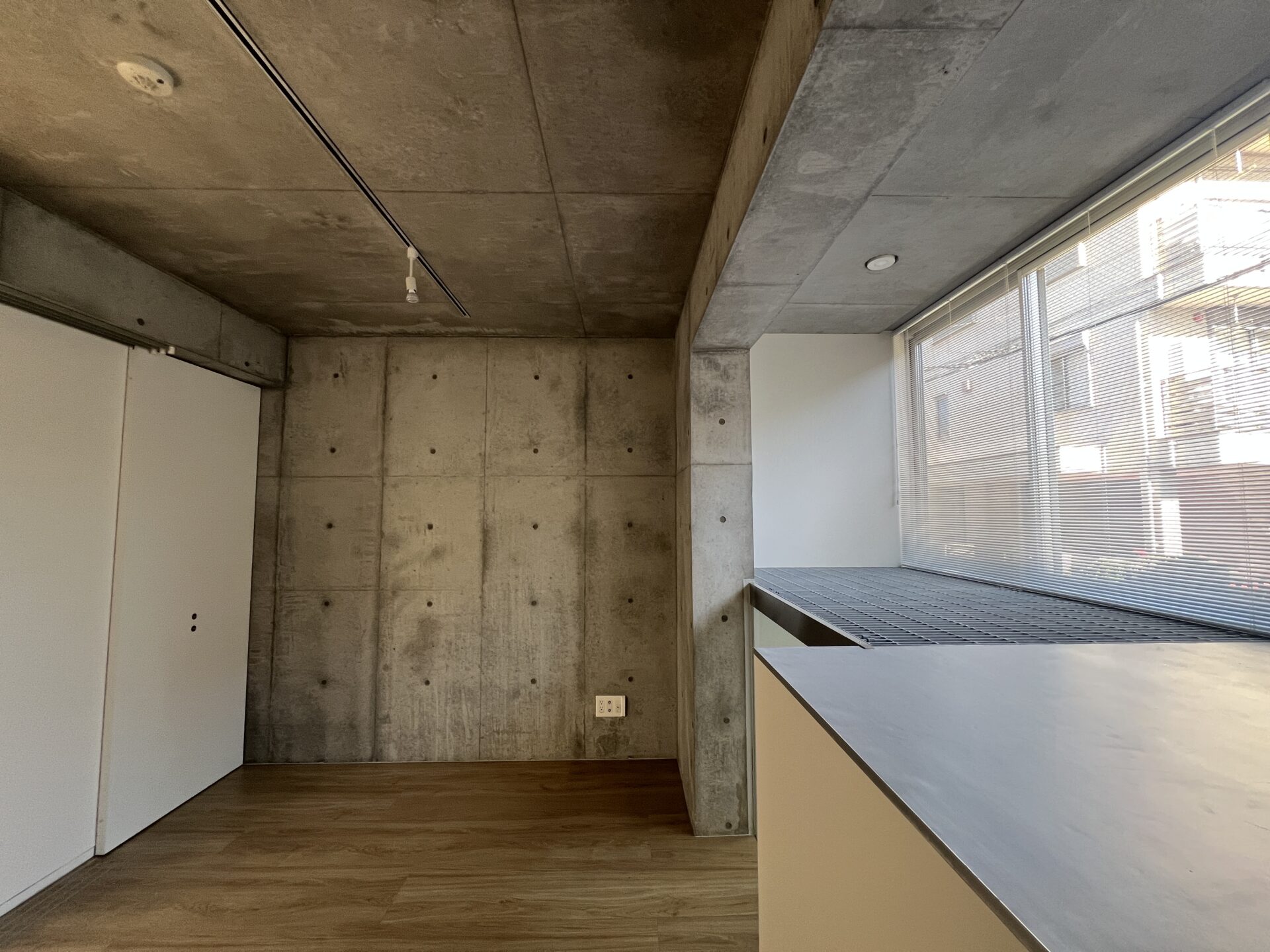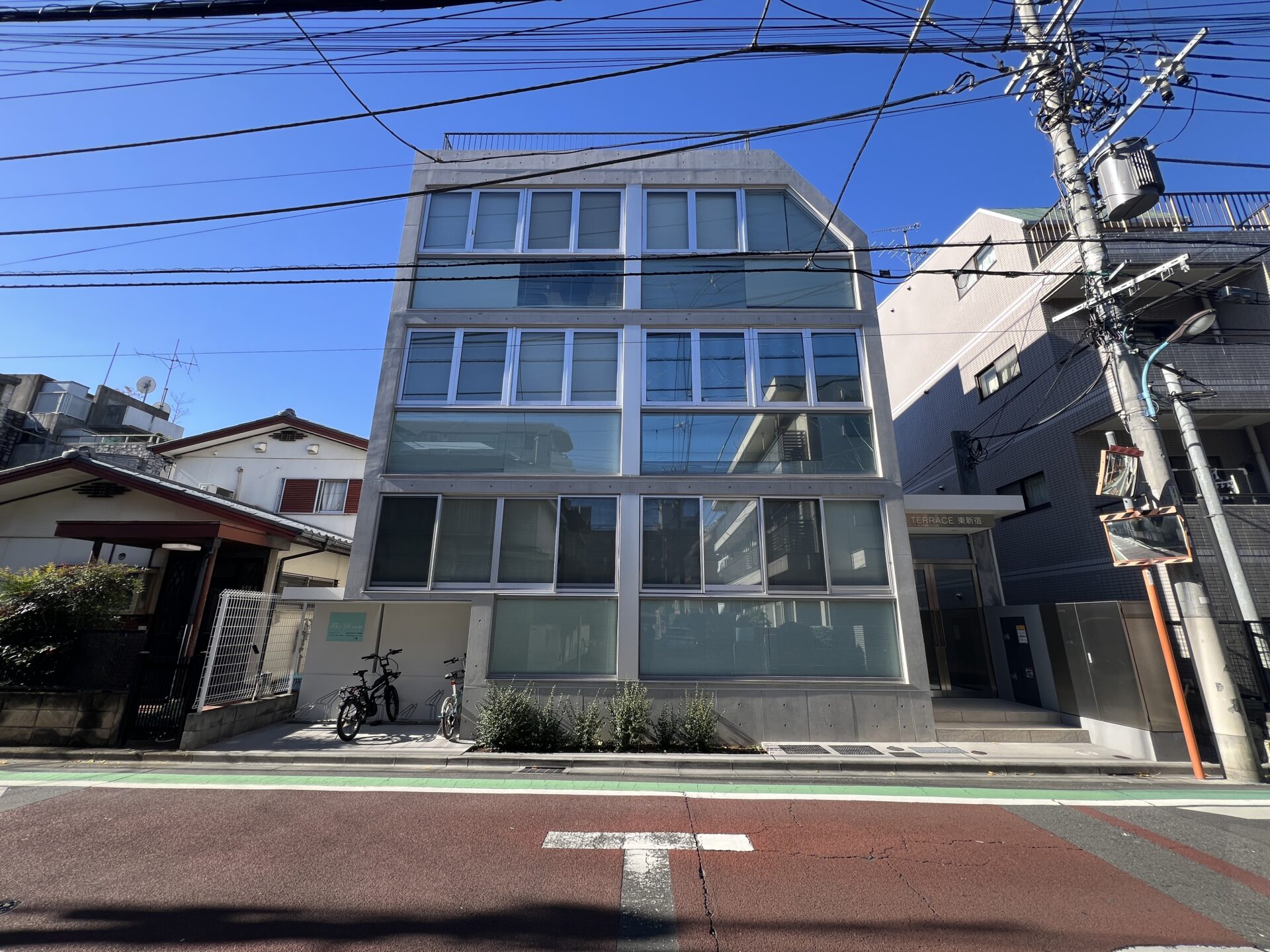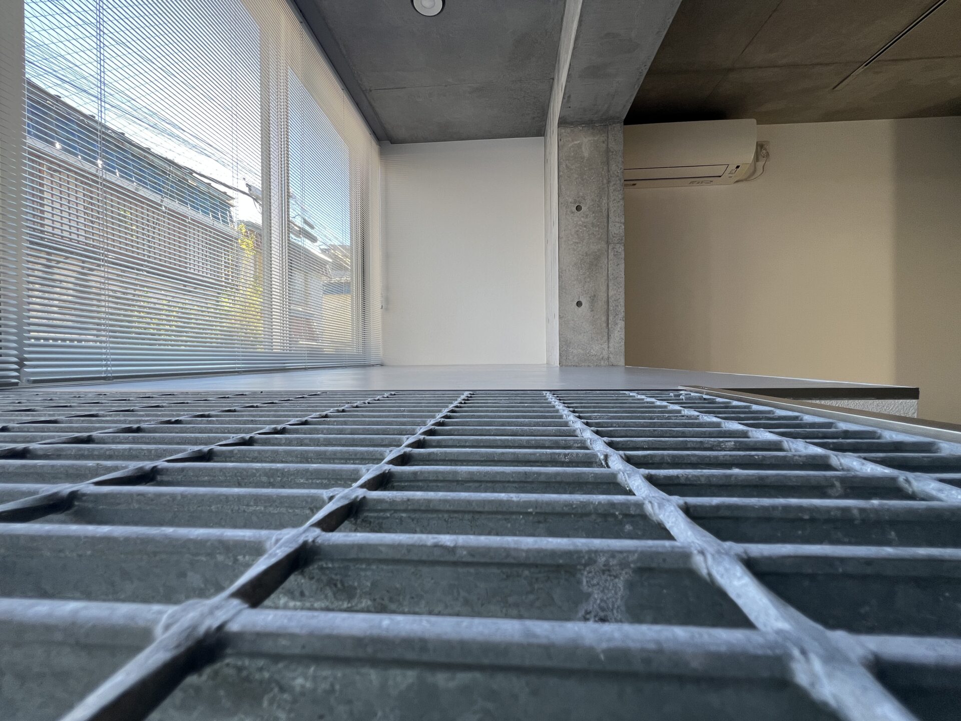 東新宿駅より徒歩9分の大きな窓とコンクリが一際目を引く建物です。近くに公園がある静かな住宅街にあります。今回ご紹介するのは、事務所利用・予約制店舗利用も相談可能なメゾネット物件。無機質なコンクリートと、日本的な要素が不思議と交合う空間でした。