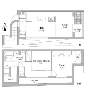 メゾネットの地下1階は水回りがまとめられています。奥に行くと6畳のたたみのお部屋があります。白タイルの床と畳の切り替え部分がなんだか可愛らしい。さらに奥に行くと収納スペースがある9畳のお部屋。一際光が入ってくるスペースがあり、上を覗くと1階のスペースと繋がっていました。そのため、ここのスペースは想像以上に天井が高く、地下とは思えない開放感があります。