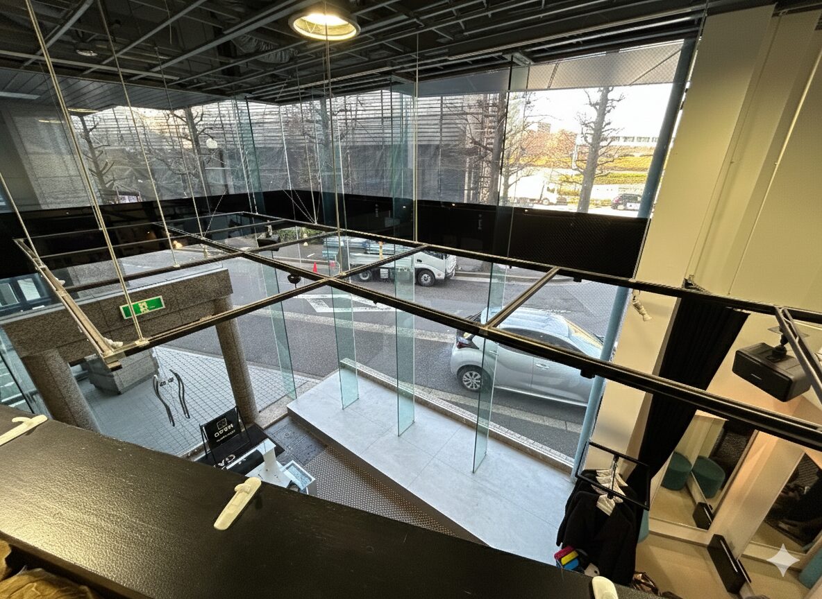 天井はただのスケルトンではありません。メタルフレームのようなラインが、不規則に散りばめられています。無機質なはずなのに、どこかデザインの意図を感じる骨組み。