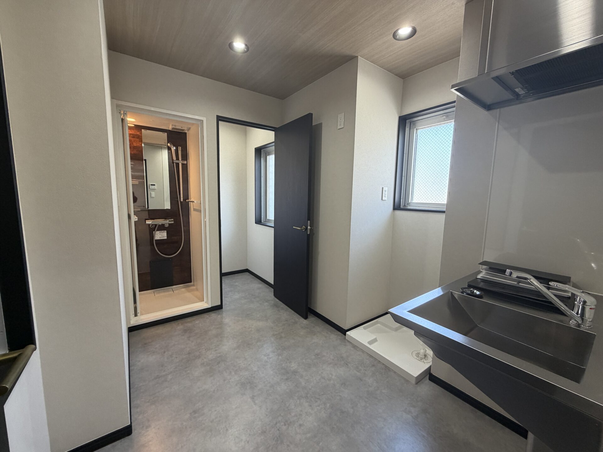 フロアはナチュラルウッド調フローリングで温かみを持たせつつ、天井にはライティングレールを走らせてスポットライトでシックさも抜け目なく。シューズクローゼットはブラックフレームのガラス引き戸で見せる収納に。もちろんトイレやシャワールーム、キッチンだってちゃんと美しい。、、完璧なのか?