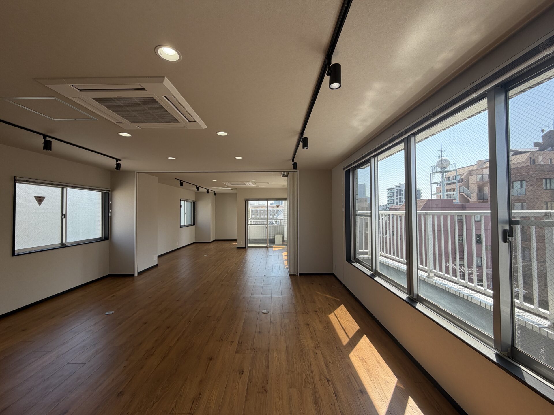 まず驚くのが窓の数。いや、ほぼ窓やん!!!とツッコミたくなってしまうほどたくさんの窓から入る光こそこの部屋のとっておきの魅力です。自然光を活かして採光性抜群のオフィスってだけでなんだか運気が高まりそう。開放感も心地よさもピカイチのこの空間、理想的です。
