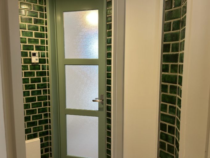 お部屋に入るとまず目に入るのは、お部屋の真ん中に位置する赤いポール。オフィスとしてなら、このポールがちょっとしたお部屋のセパレートの役割をしてくれているのかなと思います。メインは白壁ですが、入り口扉や小部屋のタイルやドアは緑が差し色に。不思議なのですが、このお部屋の空間だとこれらの色たちもとっても纏まりよく感じてしまいます。