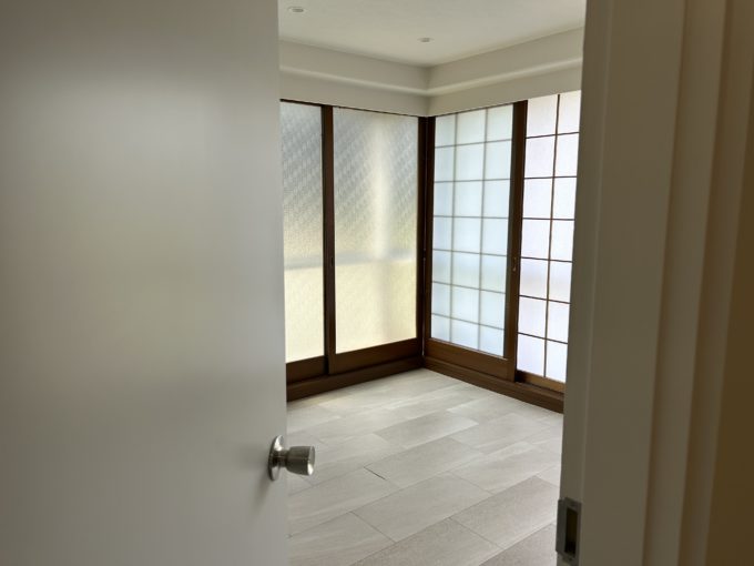 さらに奥には2部屋続きます。障子紙がピンと貼られ、曇りガラスと木枠の冊子で和の要素が強いかと思いきや、床はタイル床です。そうか、この2部屋はミーティングルームとして使えそうかな。意外にもアースカラーのソファを入れると雰囲気が増す気がしますし、ちょっとしたリラックスルームとしても良さそうかも。