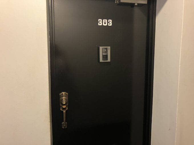 エントランスホールにも共用のお手洗いがありました。そして、お部屋の前で真っ先に目に入ってきたのは、何だかレトロなドアノブと書体が印象的な部屋番号。昭和53年築の歴史をほんわか感じました。