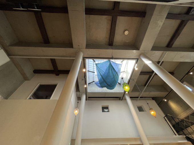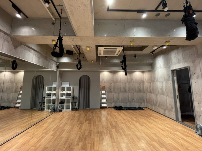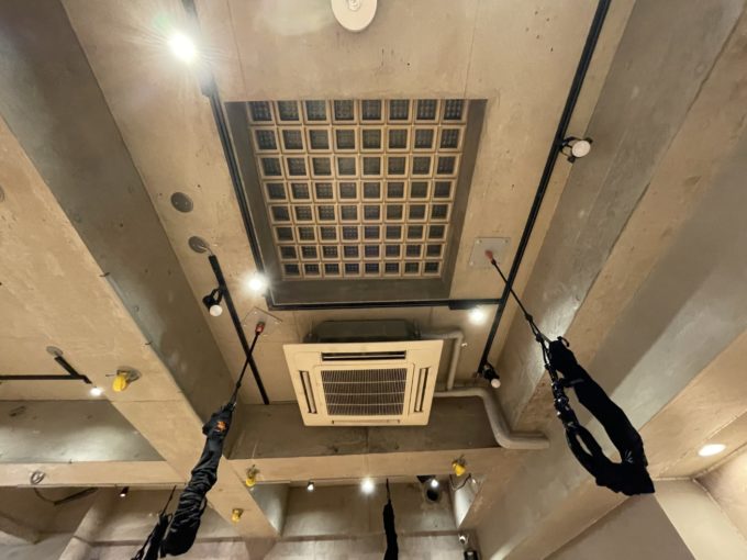 フィットネススタジオが入居中だった3階建てのビル。2階から3階までがメゾネットみたくなっており大きな吹き抜け空間がある。奥まったところにあり周りは建物に囲まれているが、天窓から春夏など太陽が高い季節は日差しが気持ち良く入ってきそうだ。