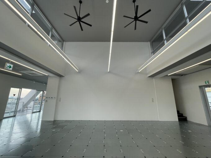 天井高も高く、特に8階フロアは元々あった9階フロアを無くすことで吹き抜けを作っているので、より空間の広がりを体験いただけると思います。アイデアは天井の高さに比例するとも言いますので、この空間では、よりクリエイティブな活動をすることが出来ると思います。天井には特徴的な遊び心のあるライトがあります。