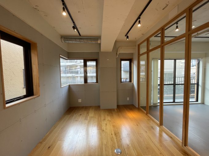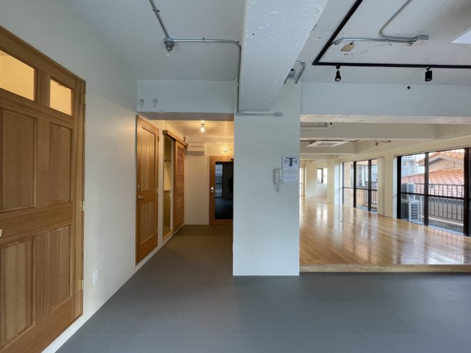 玄関は2重扉になっており、扉を開けるともう一枚ガラス扉がある。入り口スペースは広めで自転車やループも置けそうだ。天井は抜かれ白く塗装されている。男女別トイレ、ウォールシャルフも多く、ガラス張りになった4〜6名ほどで使えるMTGスペースの造作があり家具を持ち込めばそのまま入居できる。