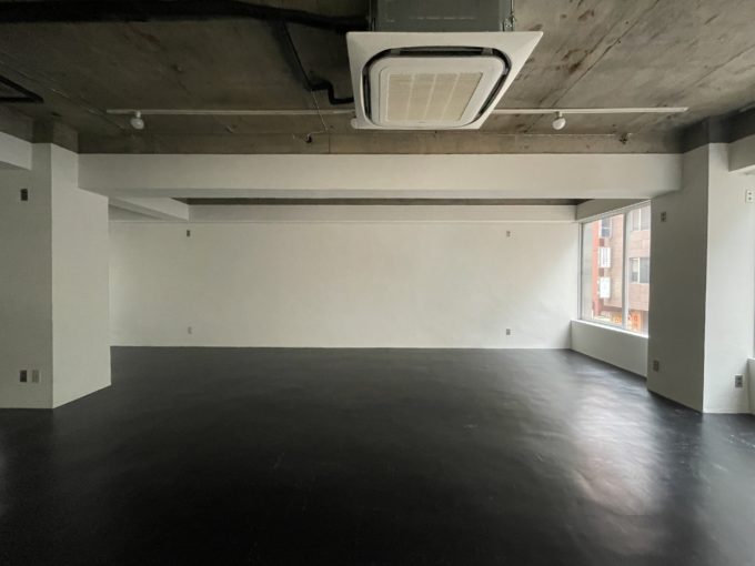 共用部のアプローチから来た、入り口部分はシャッターが下せてセキュリティー的にも目隠し的にも使えます。天井は抜けていて躯体にライティングレールが設置済み。床は黒いリノリウムでしょうか。直射日光は入らないので、どこか薄暗いTHE・雑居ビルな感じが倉庫っぽい雰囲気。探偵事務所とか入ってそうな空気感です。店舗ならニッチで専門性のある物販とかにおすすめしたいです。ビルに入ってくるとき「ここ..だよね?」と思いながら誘われる感じが想像できます。(褒めてます)