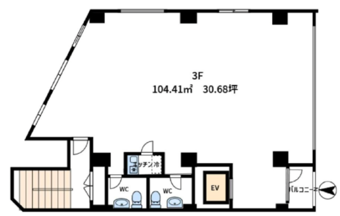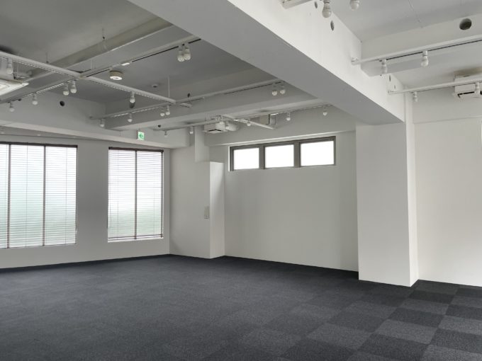 白壁に白塗装の天井、シンプルな水回りと、余計なものは削ぎ落とされた空間です。デザイン事務所やIT事務所に最適です。窓が大きく南向きなので日中は明るそう。1階はパーソナルジム、上階はゲーム会社さんが入っており、入居テナントさんは大きくなって移転される”出世ビル”なんだとか。ここから新しくスタートするにピッタシな物件。