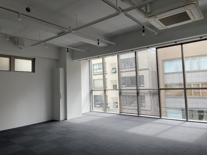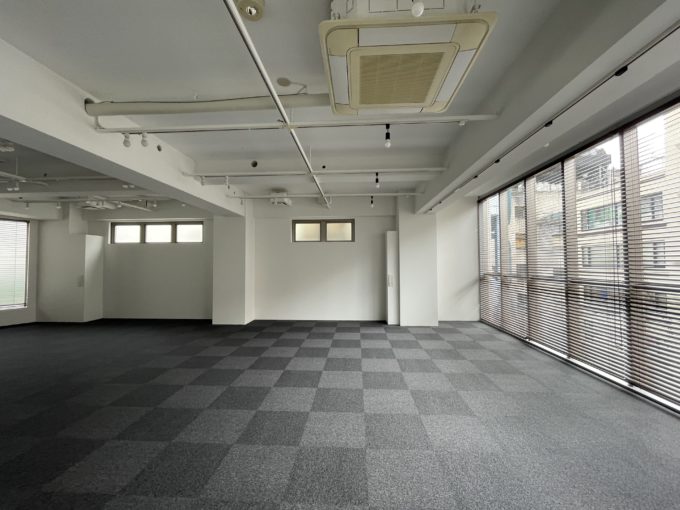 床から天井目一杯までのびた大きな窓が印象的な区画。天高は約3mほどあって30坪のスペースにより開放感を与える。床はOAフロアで、男女別トイレと、内装工事も最低限でそのまま使えそうな空間だ。繁華街駅前のためセキュリティが強固でエレベーター不停止と室内へはカードがないと入れない。