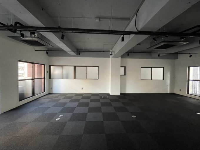 天井スケルトン×OAフロアのセミスケルトン。周辺のビルと隣接しているが明治通りからの程よい光が入る。明るすぎない落ち着いたトーンなのでパソコンと向き合う業種のオフィスに良さそう。エレベーターまで数段階段あり。