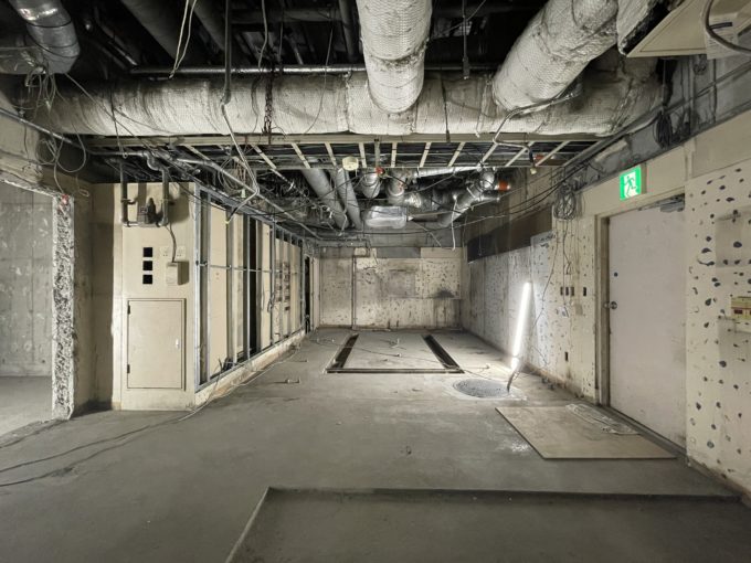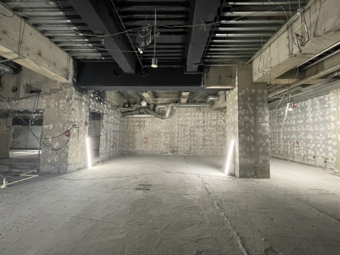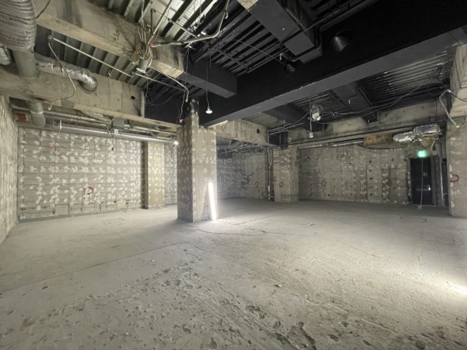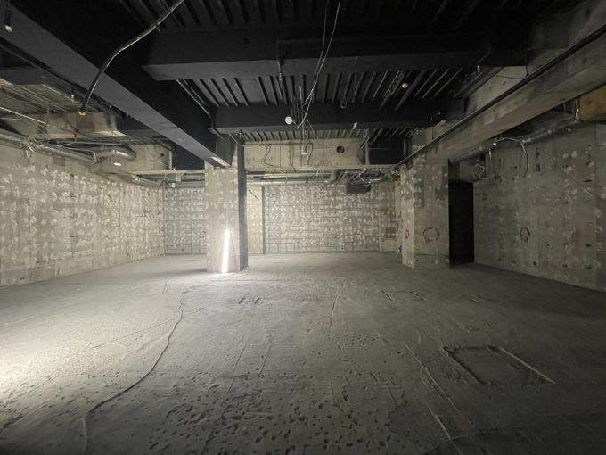 恵比寿駅徒歩1分の一等地。駒沢通りに面して駅からも見える視認性のある物件の地下1階の約78坪大型スケルトン。エレベーターと専用階段でアプローチが可能。もともと海鮮料理店が入っていましたが、今回の募集では飲食は不可。柱が2列に並びますが天高は4mあります。レンタルスペースなどにいかがでしょうか。上階がドラックストア、ホテルのため大きな音が出る使い方は難しいです。駅前の巨大空間、ニーズありそう。