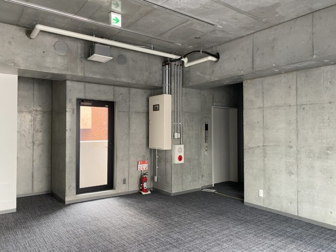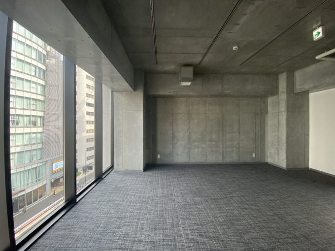 床は青みがかったカーペットが敷かれていて、空間を涼しげに彩ってくれています。天井と壁はコンクリ打ちっぱなし!天井にはライティングレールが付けられています。箱の形としては正方形に近いので、レイアウトが組みやすそう!