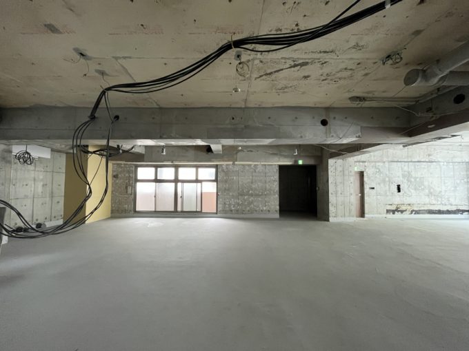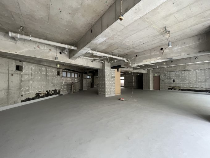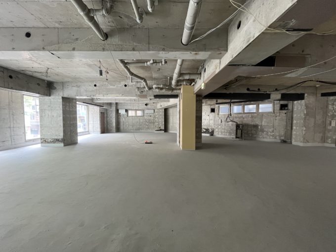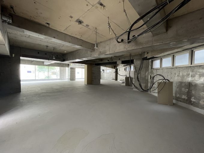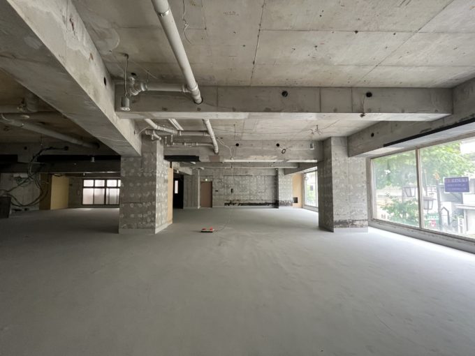 道路沿いに設けられた広い窓の側に立つと、街ゆく人と目が合う(気がする)ほど距離が近く感じる。外から注目が集まるこの場所は、どんなことに向いているだろう。広さを生かしたゆったり喫茶店でも、ショールームでもいい。スケルトンだからこそ多くの可能性が秘められているのだ。