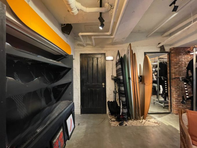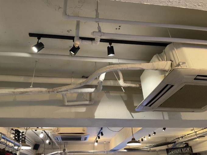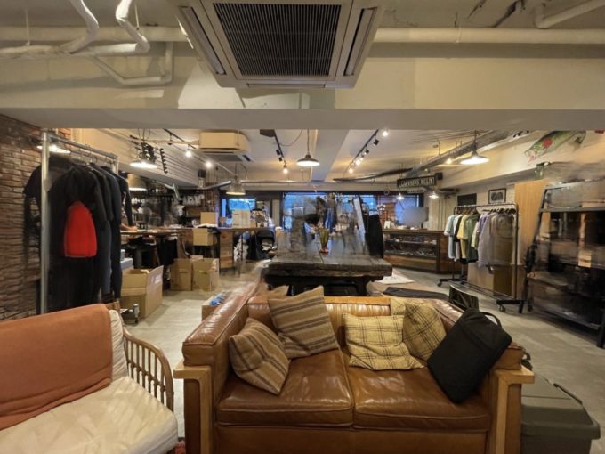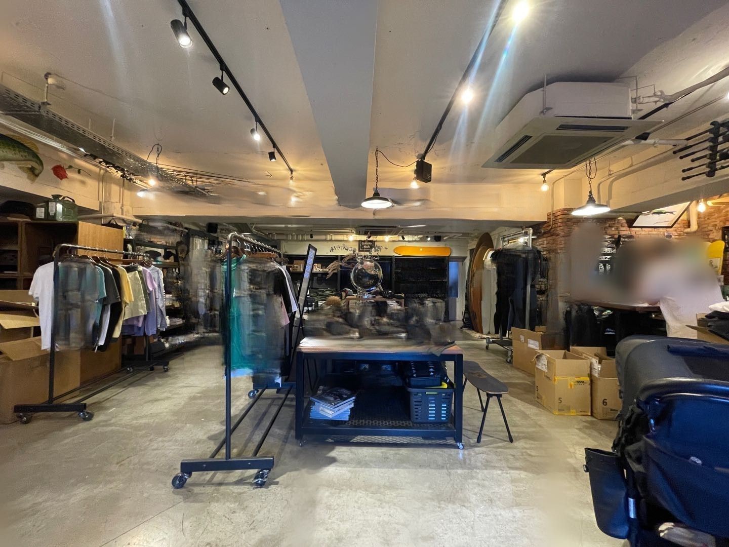 室内はスケルトン天井で、カフェカウンターやフィッティングルームがあります。