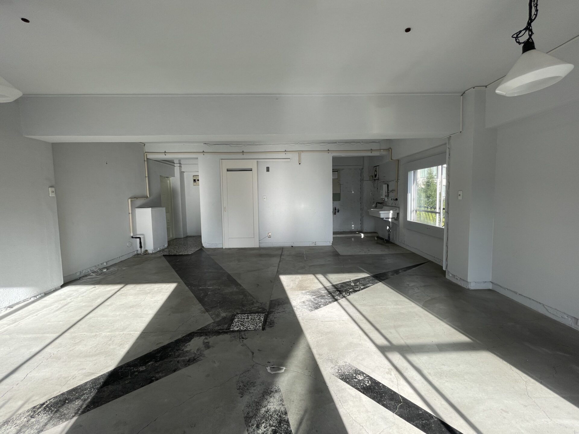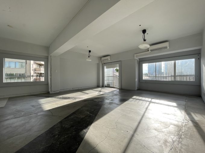 募集区画はエレベーターなしの3階になります。ドアを開けると入り口の天井からスケルトンの配管剥き出しでさっそく推しポイント。ほぼ正方形の間取りで水回りが出入り口にまとまって、レイアウトもしやすそうです。