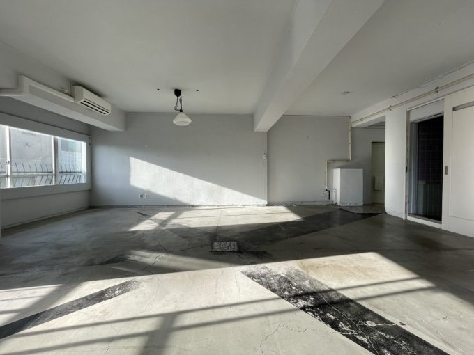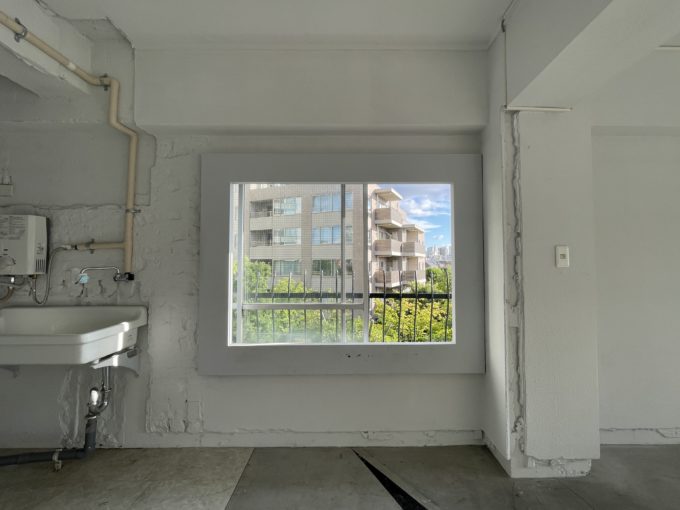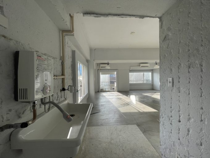 天井と壁と、無骨な白塗装がこのエリアにマッチしていました。天高は2.5mですが体感もっとありそうな解放感がありました。南西の2面採光で日当たり、風通しもよく申し分なし。団地によく見るこのボテっとした給湯器×陶器のシンクを捉えた画角がたまらないです。