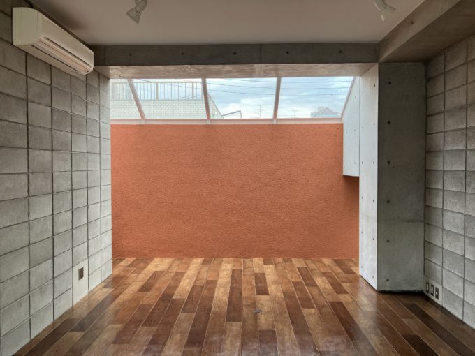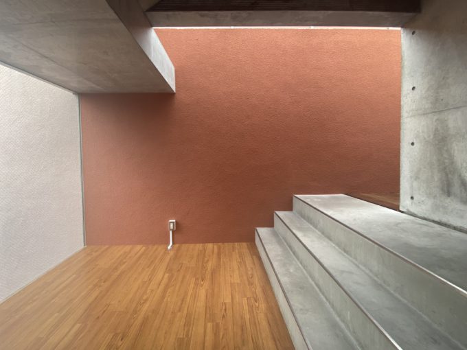 コンクリート打ちっぱなし、フローリング、そして壁面の温かみのある朱色の漆喰。見ていて飽きることのない空間です。