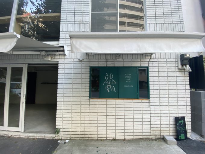 1階の外側から見ると、まだ飲食店の名残がある看板と、テイクアウト時に使用していたかのような小さな窓。