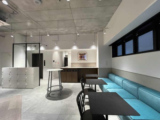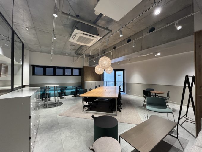 真ん中に8名がけの大きい島があり、ほかソファやカウンターテーブルなど作業場所、打ち合わせ場所が散り散りにあります。個室の会議室はないのですが建物1階に貸し会議室がございます。ロッカーも完備されているのは地味に嬉しいです。