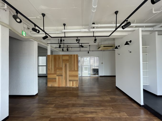 天井が抜けていて、白天井にライティングレールが吊り下がっています。床は濃い木のフローリングで空間が締まります。OAフロアではありません。