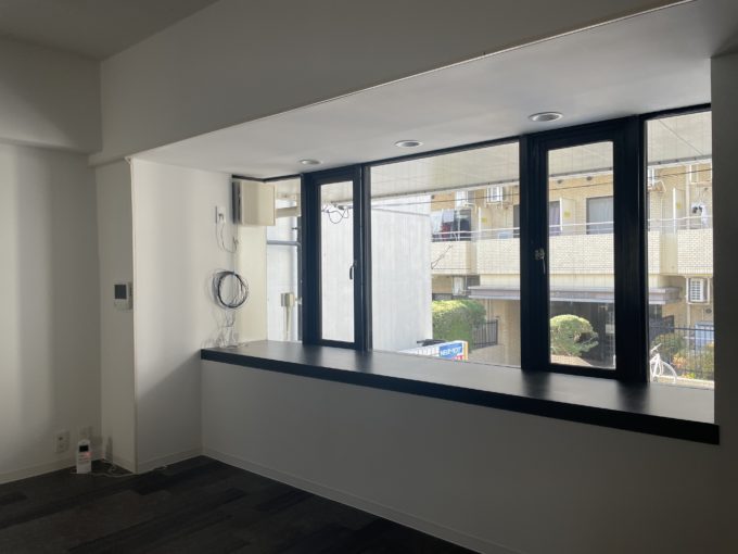 部屋に入ってすぐに大きな出窓が!内装は白塗装の壁に天井はスケルトンで洗練された空間です。配管、照明も白で統一、空調や水回りが新品という清潔感が魅力的。床は黒っぽいフローリング調でした。
