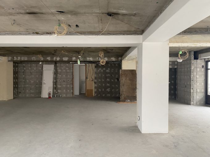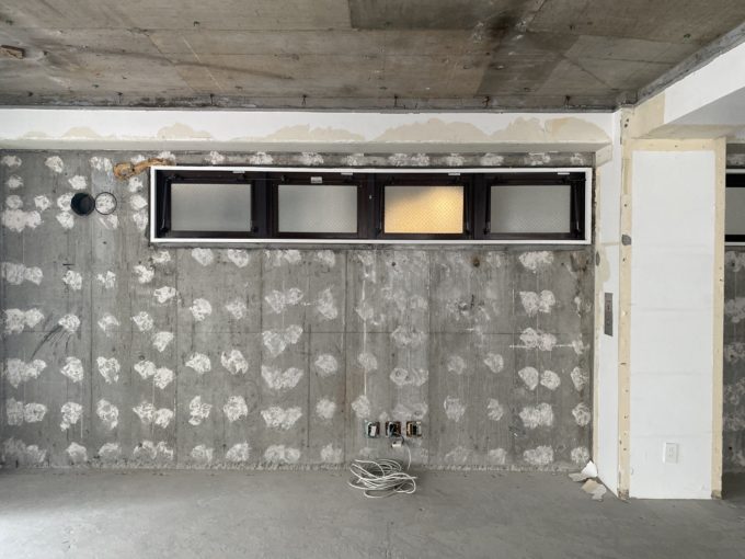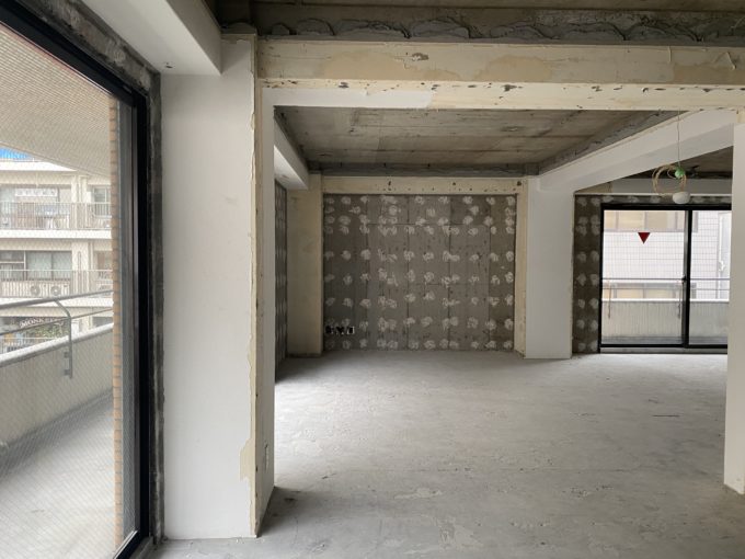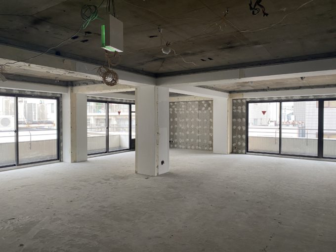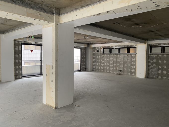 ドアを開けると、間仕切りなどが全くない躯体丸出しの広々スケルトン空間が!大きな窓もあるため、無機質な空間でも閉鎖感はあまり感じません。