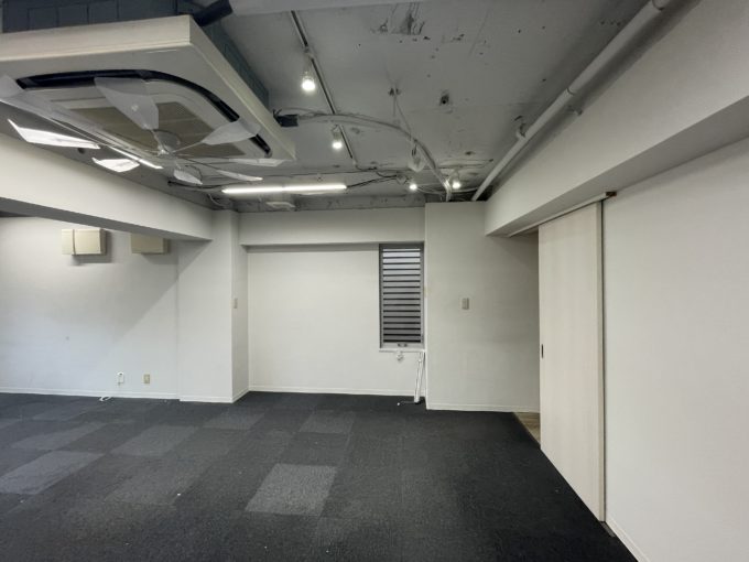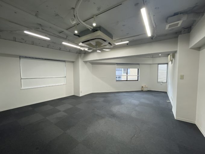 募集区画は最上階の4階。交差点の角地に立地するので、日当たりの良い区画です。内装の仕様は、天井が躯体剥き出し、床は手前のスペースがフローリングで、奥がタイルカーペットになっています。前テナントは事務所兼撮影スペースとして使っていたようで、壁が一部水色になっています。
