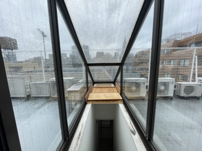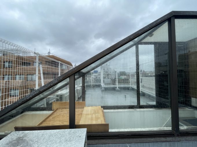 登ってみると、階段の先がガラス屋根でサンルーム的な感じになっていて、両サイドの扉から屋上へ出れました。