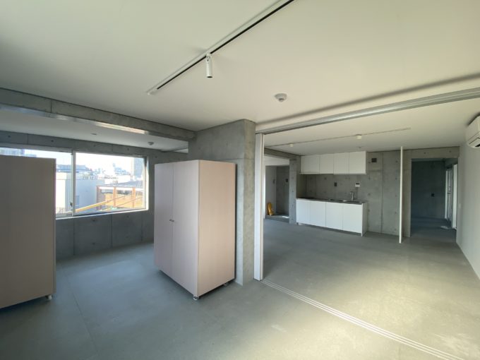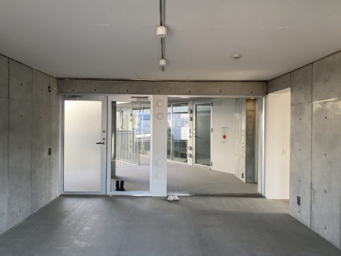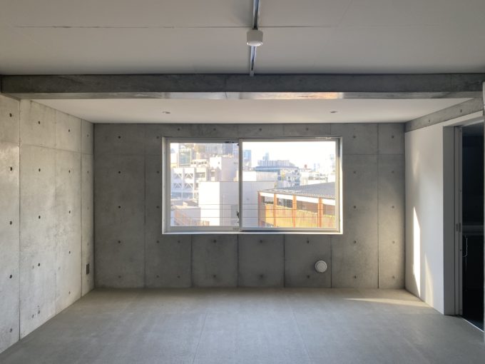 天井は貼られていますが、壁はコンクリ打ちっぱなし、床はモルタル風シートが貼られており、無機質ながらどこか安心感も兼ね揃えた空間になっています。