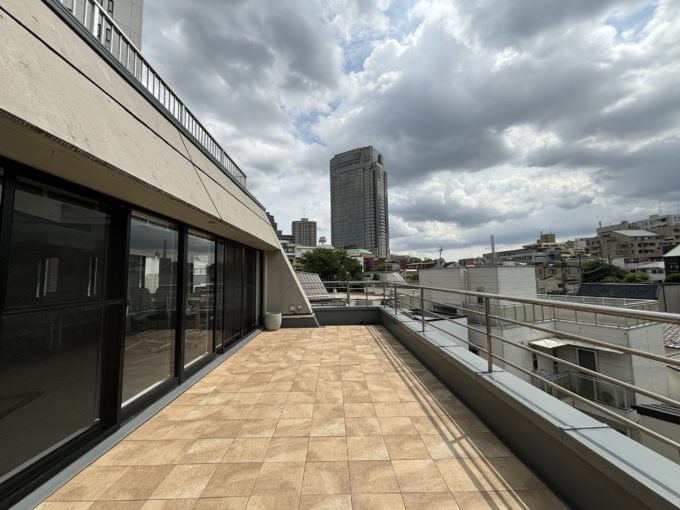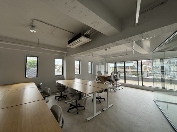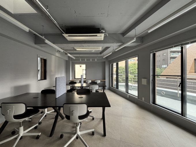 室内は家具什器つきのセットアップオフィスです。天井は躯体現しのスケルトン。ざらざらとした躯体が味があります。執務スペースには10名掛けデスクと、4名掛けのハイテーブル。さらに何と言っても、注目は広々専用バルコニーです。奥行きもかなりあってソファやパラソルを置いて、植物園みたくしたいです。