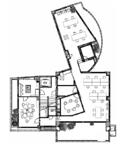 バルコニーを横目に奥に進むと丸テーブルが密集した6名掛けの会議室が。さらに奥には洗面台のある小部屋があり、ここはテストキッチン的に使えるのでしょうか。住居の名残を感じました。