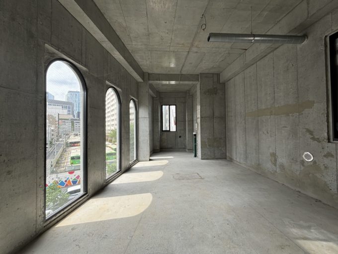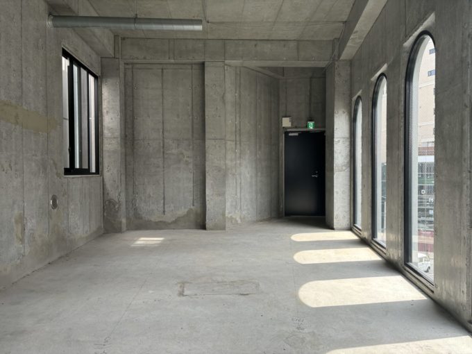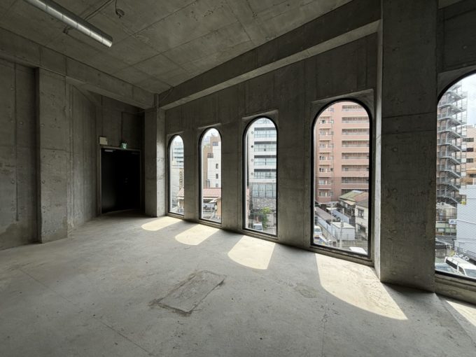 扉を開けると、まず目に入ってくるのが並んだアーチ状の窓とコンクリ世界。天高3.8mと外観からは想像できない特別な空間が広がっていました。形としては長方形の間取り。海外のお城のようなアーチ窓がなんとも素敵です。アーチっていいですよね。
