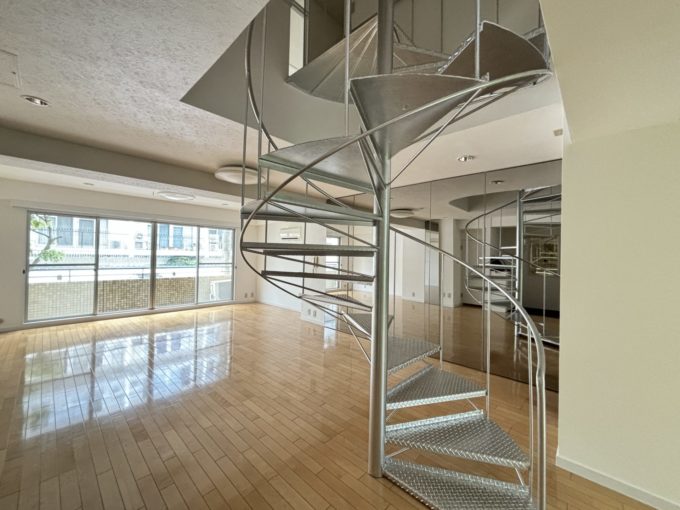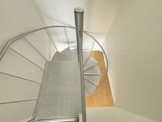 室内は住所仕様のメゾネットになっています。床はフローリング、壁はクロス、照明も住居感のある丸い照明が設置されています。なんといっても目を引くのが、室内の中央にある剥き出しの螺旋階段。遠目からみるとUFOに吸い込まれるみたいです。そんなタイトルの物件記事がありましたな。