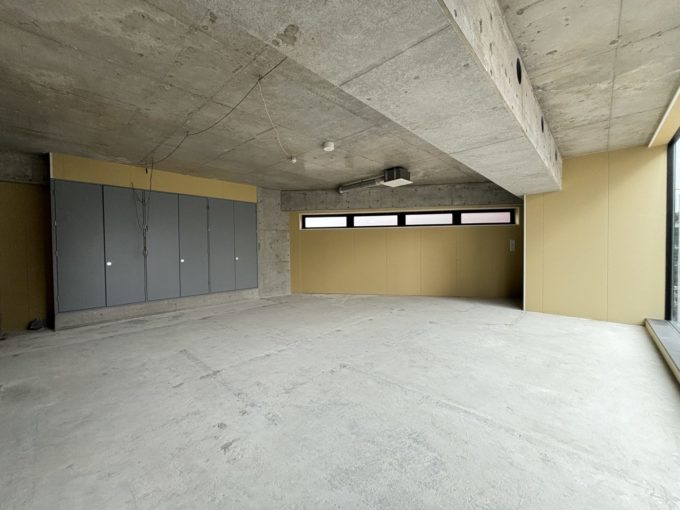 嫌な凹凸もなく、綺麗に始まって綺麗に終わる、そんな落ち着く空間です。一部ボードが貼ってあります。天井から床まで広がる大きな窓は南向き!さらに建物の前は細い通りができているため、軽い抜け感がある分、晴れていたら気持ちいい日当たりになりそうです。梅雨真っ只中の撮影は難しいんです..。