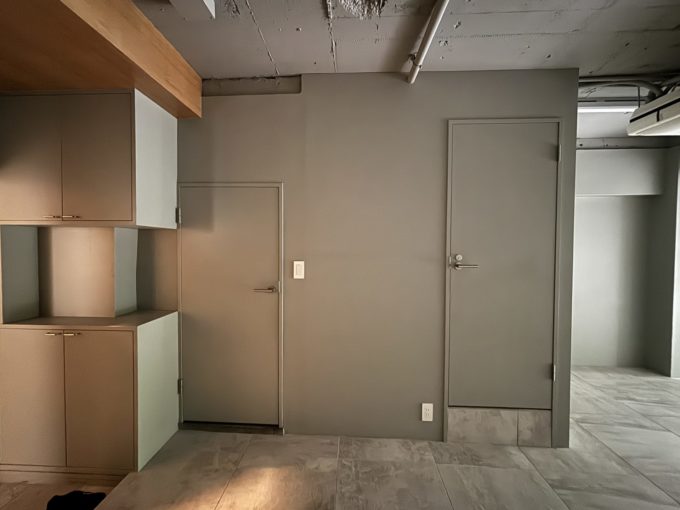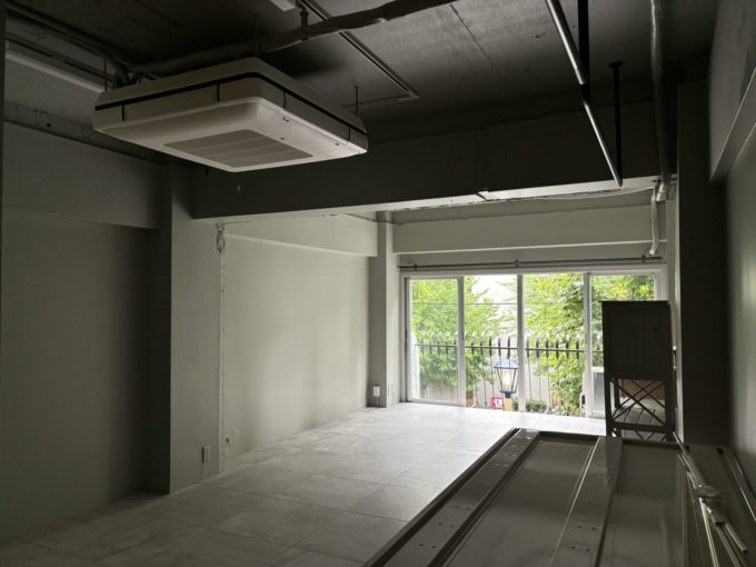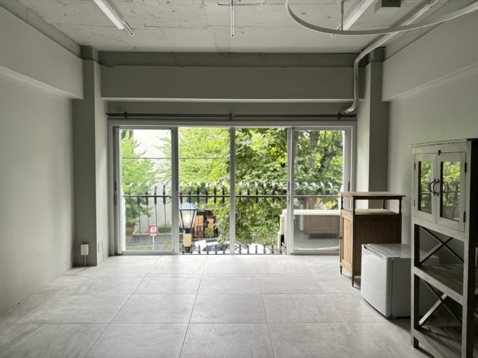 室内は天井、壁が躯体現しとなっており、淡いグレーに塗装されています。窓から見える緑とのコントラストがとても素敵でした。床はグレーのタイルシート。天吊のハンガーパイプ下の床が一部木目風になっています。前テナントは事務所兼ウエディングのショールームでした。一際インパクトのあるサークル上のカーテンレールは試着室でしょうか。