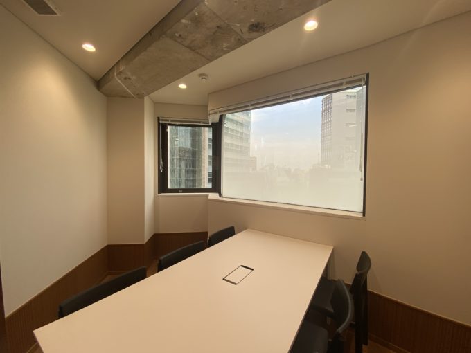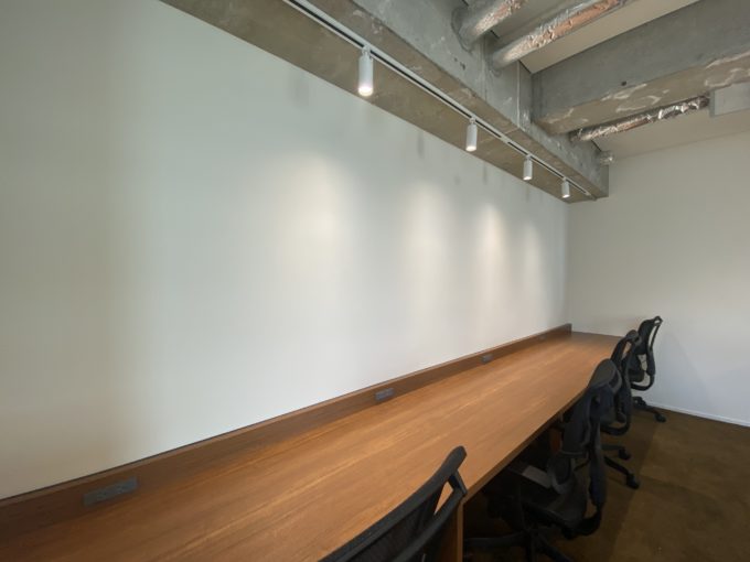 初っ端から条件について熱く語っちゃいましたが、その内装ももちろん良いです。特徴的なのは天井。ハリ部分は剥き出しになっていながらも、それ以外はボードが貼られているような仕上げでした。剥き出し×綺麗の絶妙なバランスが、なんともスタイリッシュです。ミーティングスペースとフォンブースもあります。
