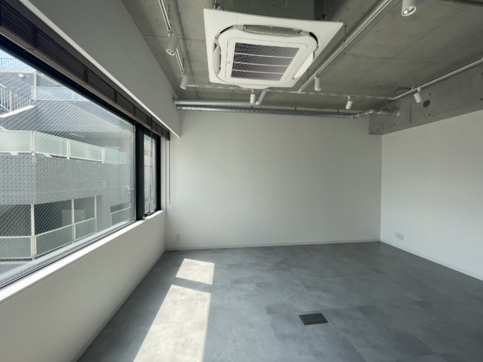 また中央部分には段差があり、1段上がるとOAフロアに。実は元々フルスケルトン状態だったのをオーナーさんが空調やトイレ、シンク設置などの工事をしたおかげで、事務所として即稼働が可能な仕様になっています!