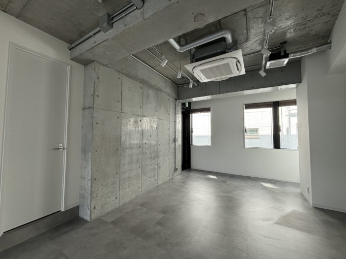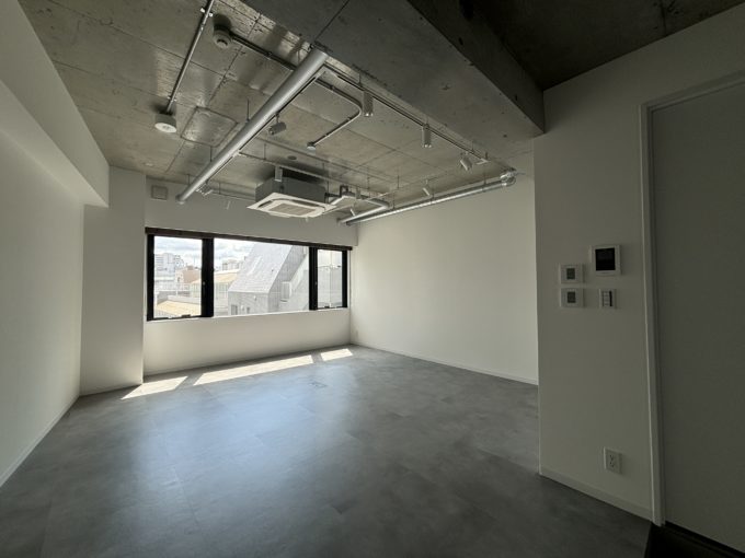 室内の仕様は、グレーの塩ビタイル、壁は白いクロス、天井はコンクリート剥き出しの躯体現し。個人的には巾木が白い点も推しており、巾木が白いおかげで空間全体に統一感をもたらしています。