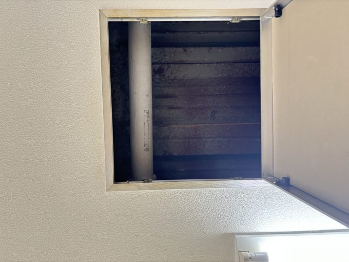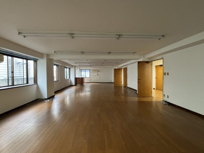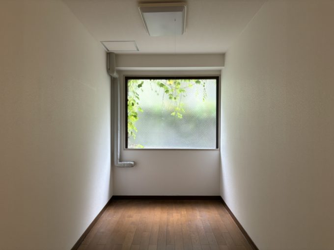 1階ですが住宅街の奥まったところにあるため、窓からの人通りは気になりません。フローリングに蛍光灯照明と、一般的な事務所仕様。キッチンや受付カウンターがあったり、住居のようなクリニックのような雰囲気があります。ありがたいことに天井の点検口が空いていて、測ってみたところ天井抜くと2.7mあるようです。