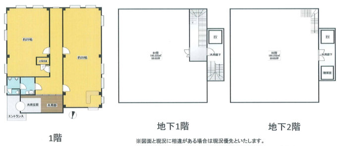 地下1F、地下2Fともに約60坪のスケルトン空間がドドンと広がっていました。床の仕様が異なり、地下1Fはフローリングで天井の高さは2.7m。