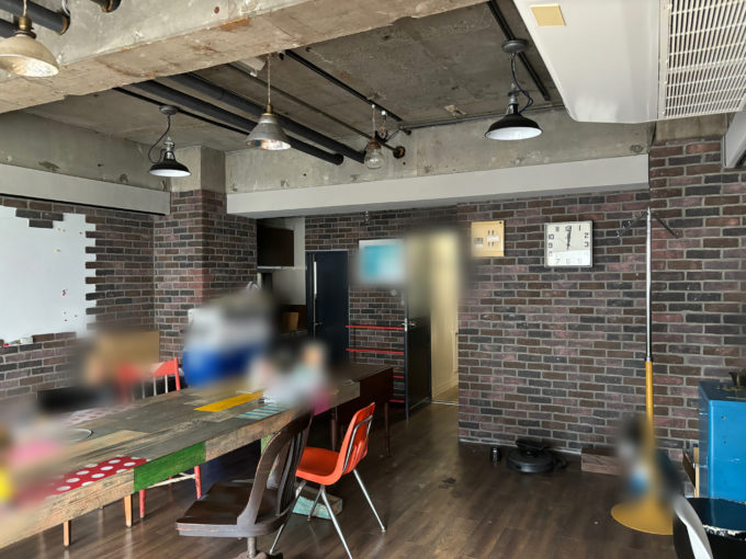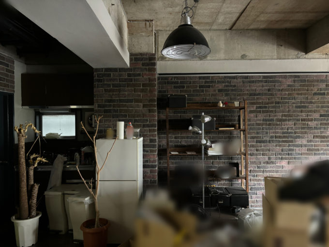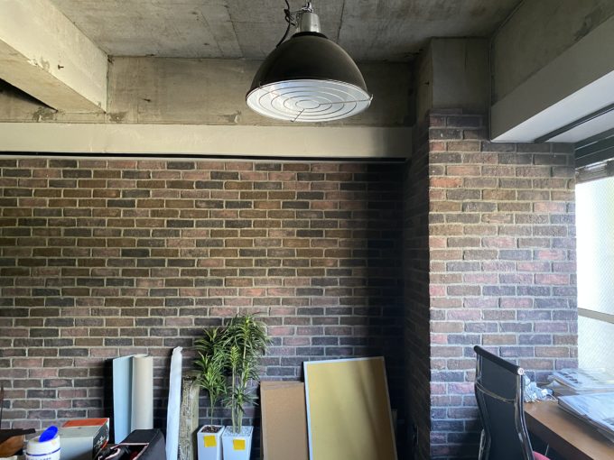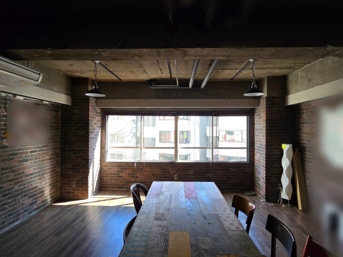 前テナントさんは片方を執務スペース、片方を会議室としてゆったりと使われていました。会議室のほうにはブリックタイルの間にホワイトボードが貼られています。片側のトイレを完全に潰して倉庫にされており、ワンフロアならではの内装と導線になっています。