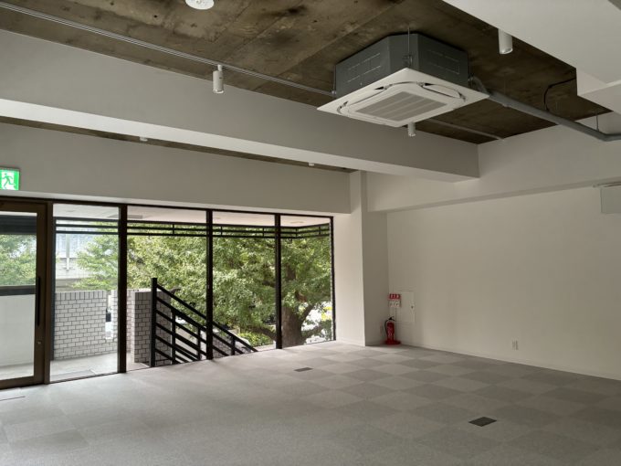 建物正面に専用階段があり踊り場で折り返して、入り口前にはゆったりとしたエントランスペースがあります。事務所利用はもちろん、店舗として使用する際に専用アプローチがあるのと、エントランスが広いのは高ポイントですね。植栽を置くだけでもワークスペースの顔をしっかり構えられます。