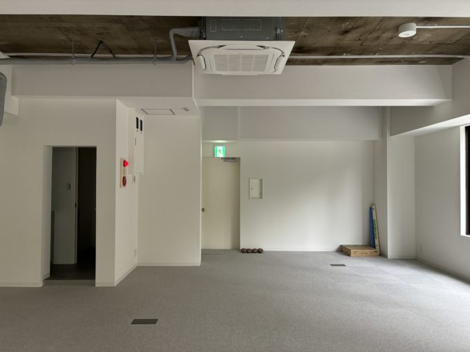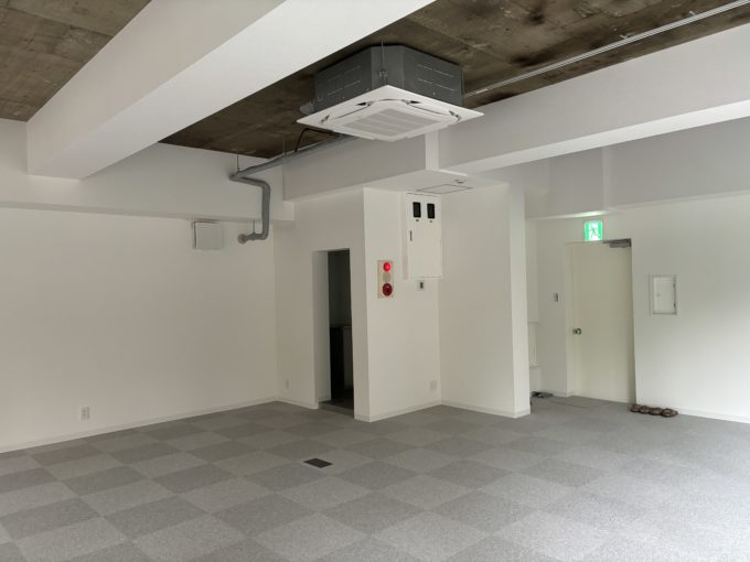 室内は天井が抜けてスケルトンに事業用天カセエアコンが1基。床はタイルカーペットのOAフロア。壁・梁は白い壁紙クロスです。水回りは、奥側にまとまっており、シンク・手洗い場ともにデザイナーズでスタイリッシュです。
