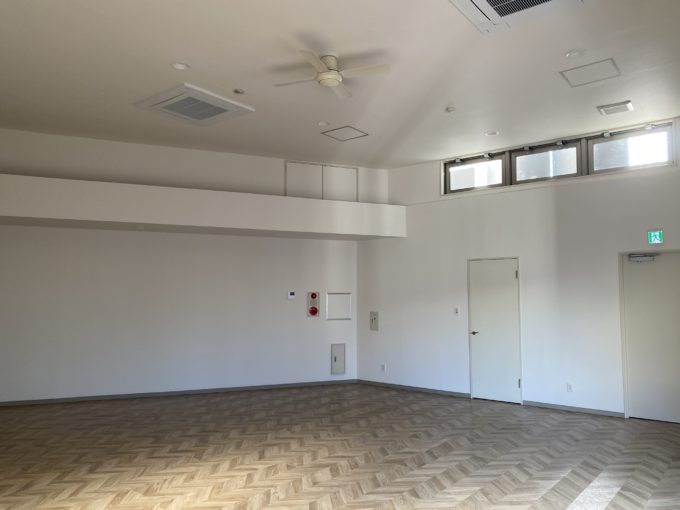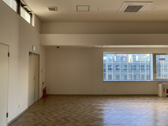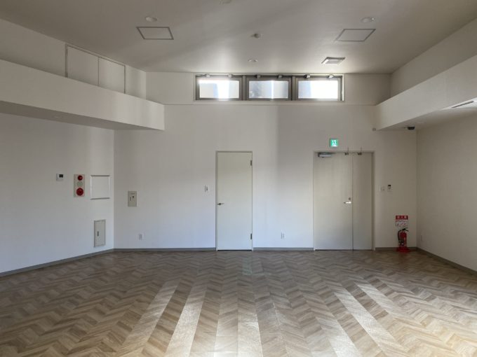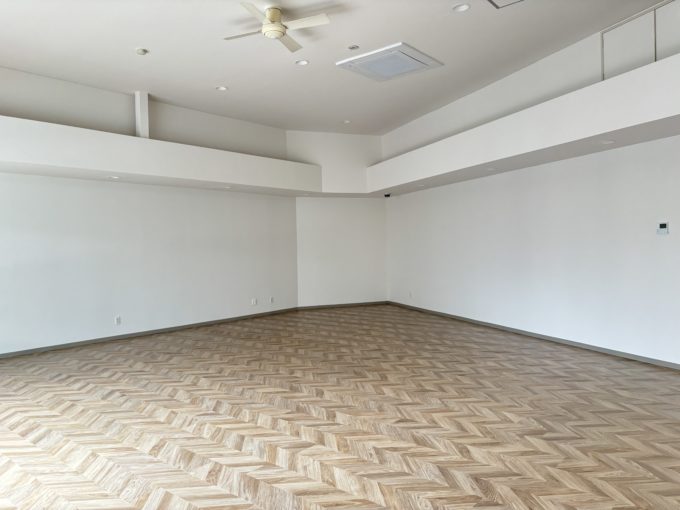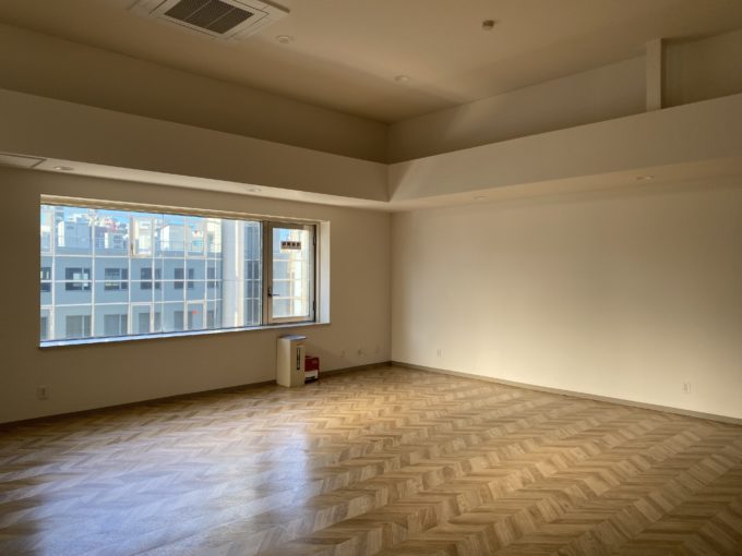 さて、お待ちかね扉をあけると、圧倒的開放感。天井は貼ってありますが、天高3.6mの脅威的空間でした。思わず声出ます。床はヘリボーンのフロアシート。壁は白いクロス。
