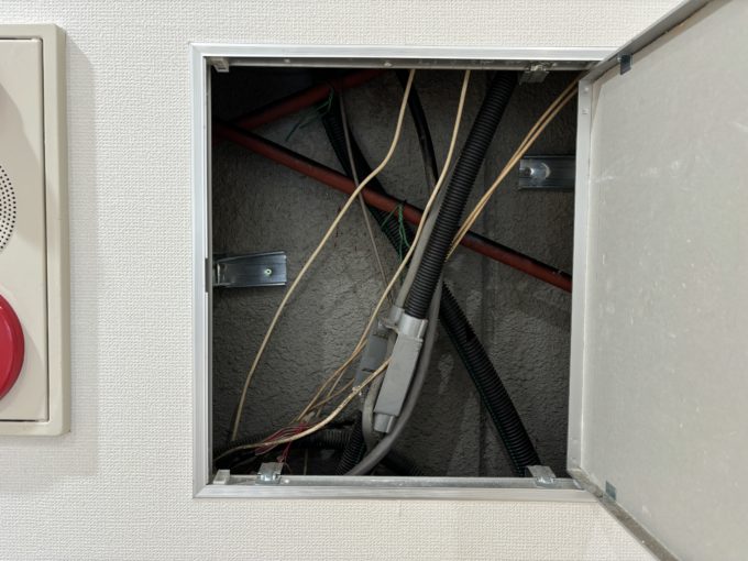 窓は道路側一面のみで、避難用の梯子も窓際に固定で鎮座していますので、窓際はフリースペースにしても良いかもしれません。記事の写真はノー加工なのですが、照明のONOFFでだいぶ風合いが変わりました。壁に点検口があったのでちょっと失敬したら、躯体の感じが見えました。