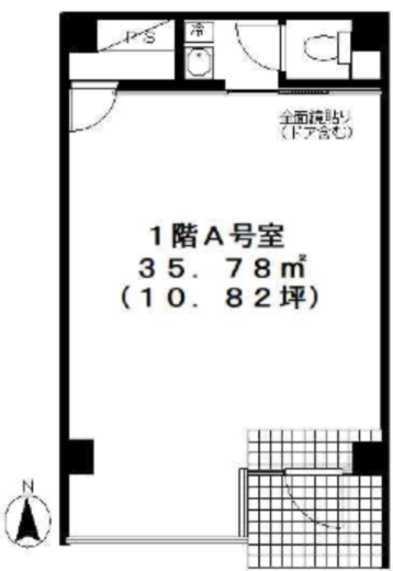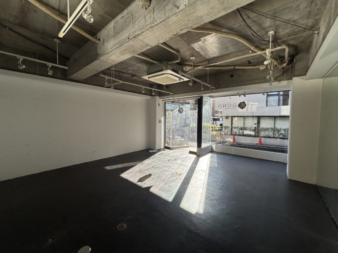 物や造作物があって少しイメージがしずらいですが、モノがなくなったらかなりスッキリしそうです。間取りが癖のない正方形なのでレイアウトも組みやすそう。天井はスケルトンで空調やライティングレールは残ります。白壁に黒床。什器を置くとしたらヴィンテージ感のあるウッディテイストも合いますし、躯体にあわせてステンレス系で統一するのも当然に合いそうです。カメレオン区画な気がします。